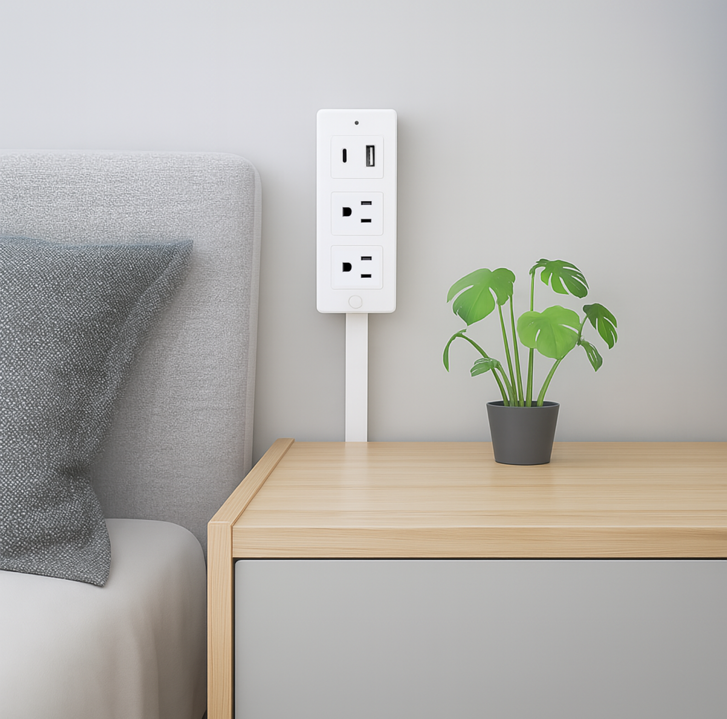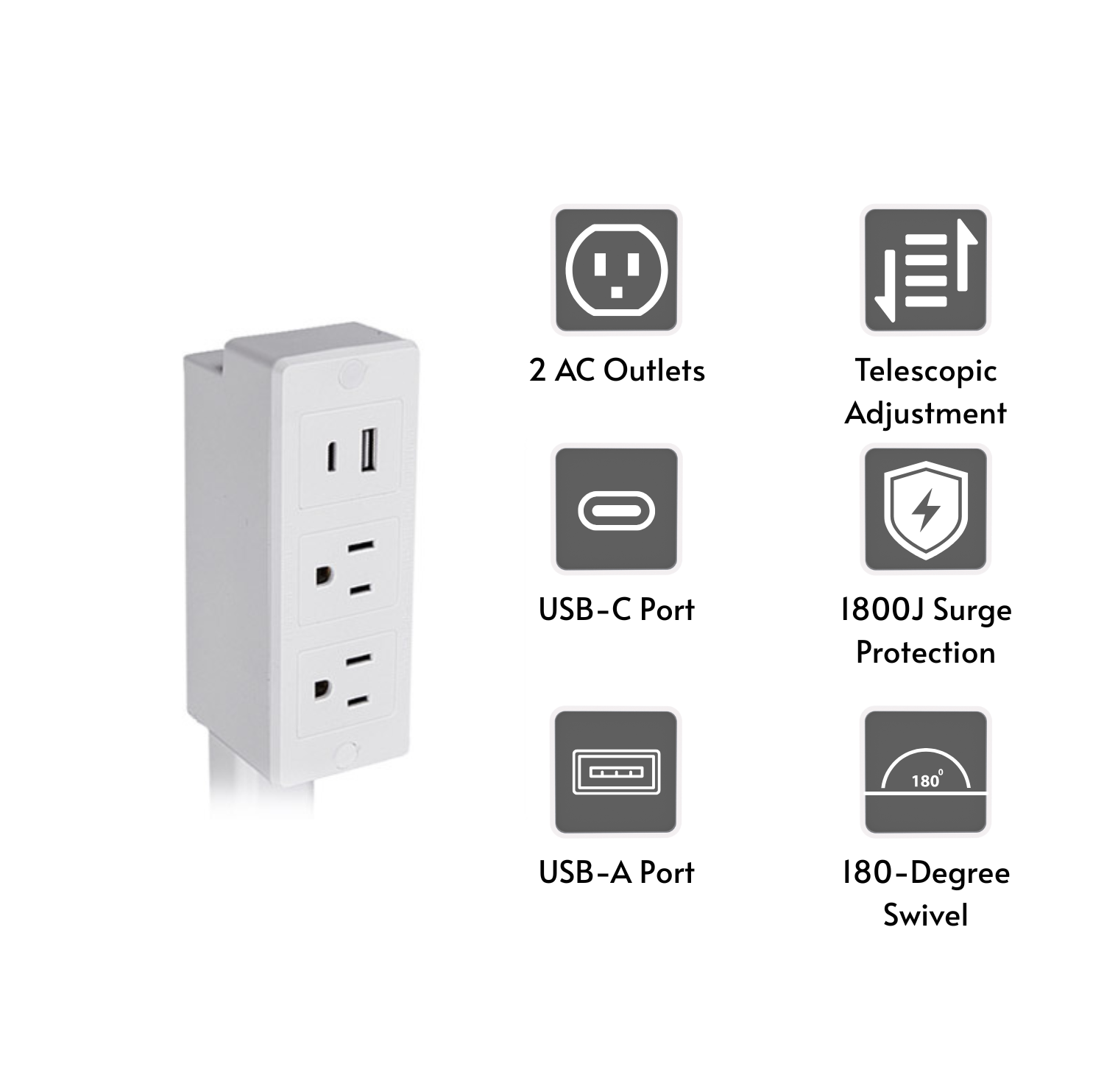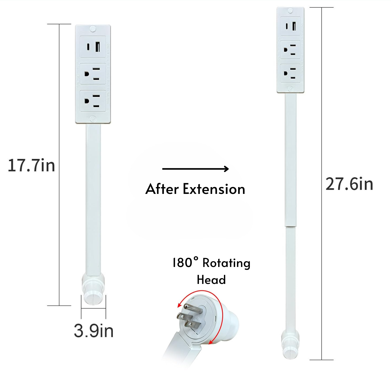Adjustable outlet arm extends from 17.7" to 27.6" with a 180° swivel base—perfect for hard-to-reach plugs behind beds, sofas, and desks.